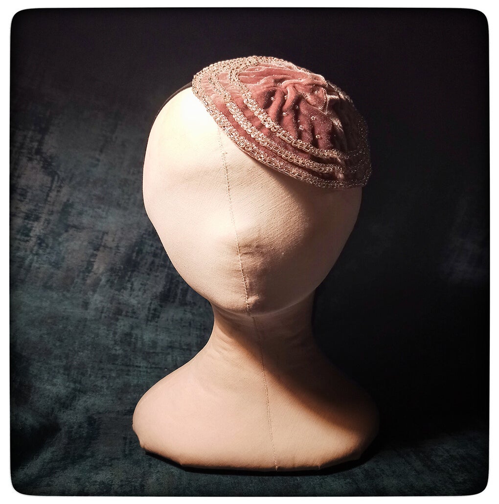 A delicate, handcrafted fascinator made from antique rose velvet, intricately embroidered with shimmering silver glass beads. Secured with a slim black taffeta ribbon that ties into a small bow at the nape of the neck. Inspired by a headpiece worn by Josephine Baker in a 1932 photoshoot, this unique creation captures the elegance of the era. A true one-of-a-kind piece, meticulously crafted by hand.