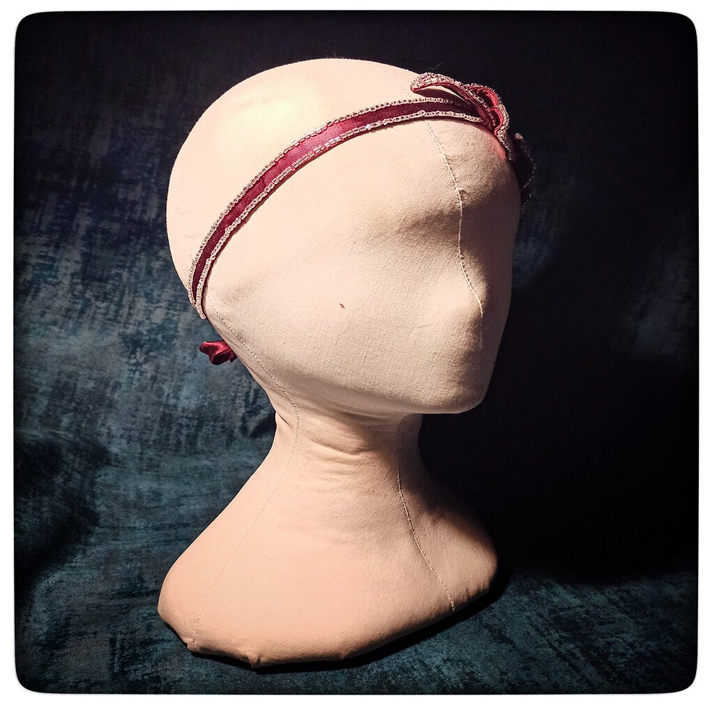 A unique, handcrafted leaf crown made from deep Bordeaux satin, intricately embroidered with shimmering silver glass beads. Designed to elegantly frame one side of the head, this one-of-a-kind piece embodies timeless craftsmanship and artistry.