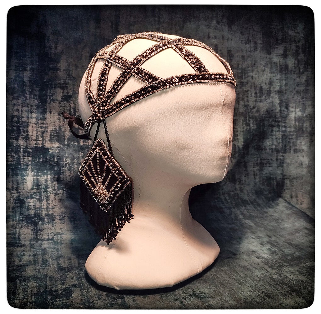 A striking, handcrafted headpiece made from black satin, adorned with intricate embroidery featuring silver and black glass beads as well as black sequins. Elegantly draping, embroidered diamond-shaped panels with delicate pearl fringe add movement and sophistication. A unique, one-of-a-kind creation, meticulously crafted by hand.