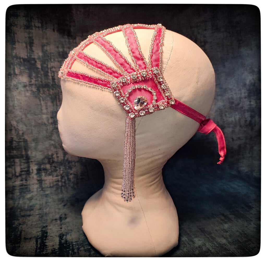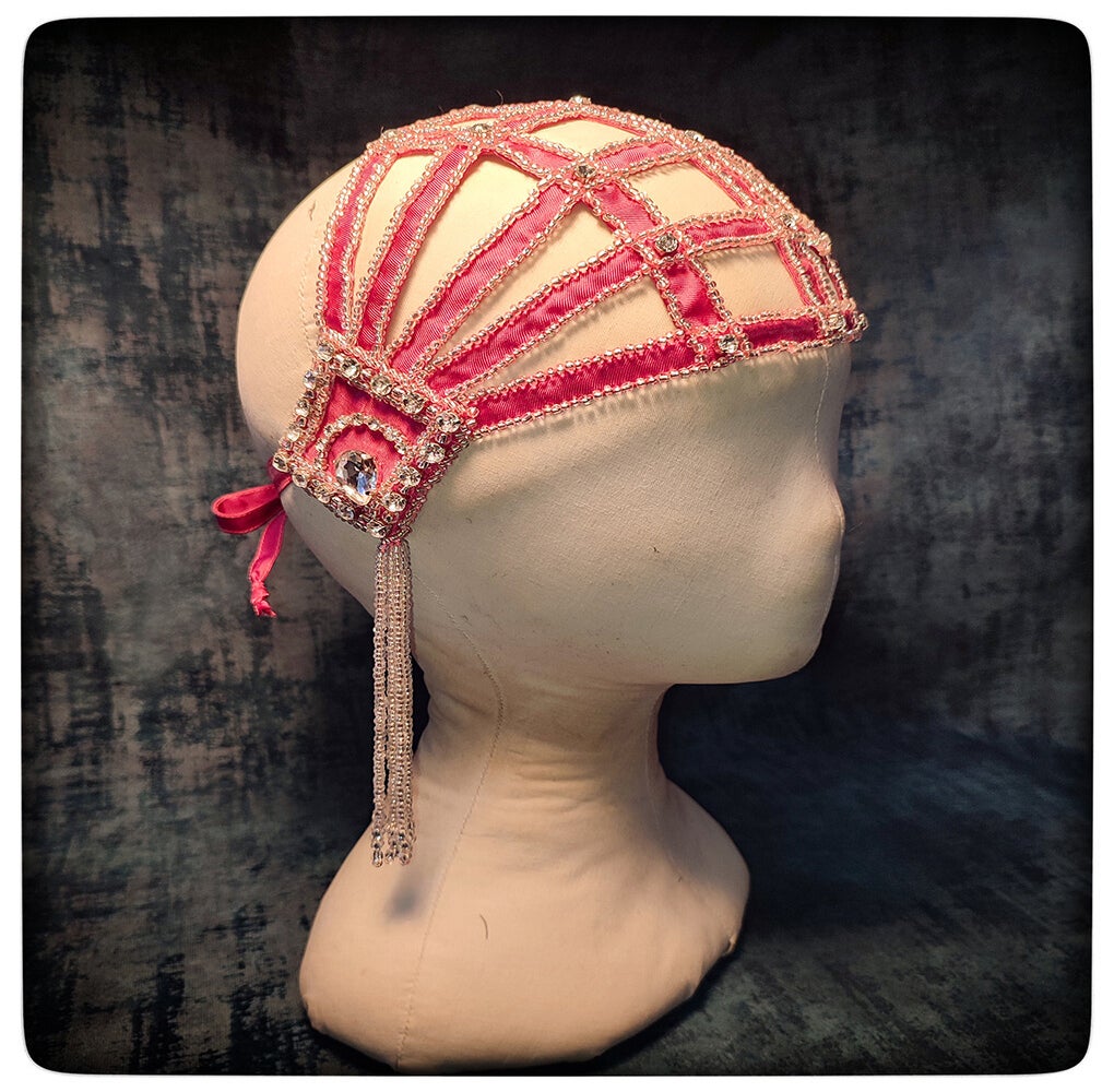A vibrant, handcrafted headpiece made from pink vintage satin, intricately embroidered with silver glass beads and sparkling rhinestones. Delicate pearl tassels hang gracefully from the sides, adding movement and elegance. A unique, one-of-a-kind creation, meticulously crafted by hand.