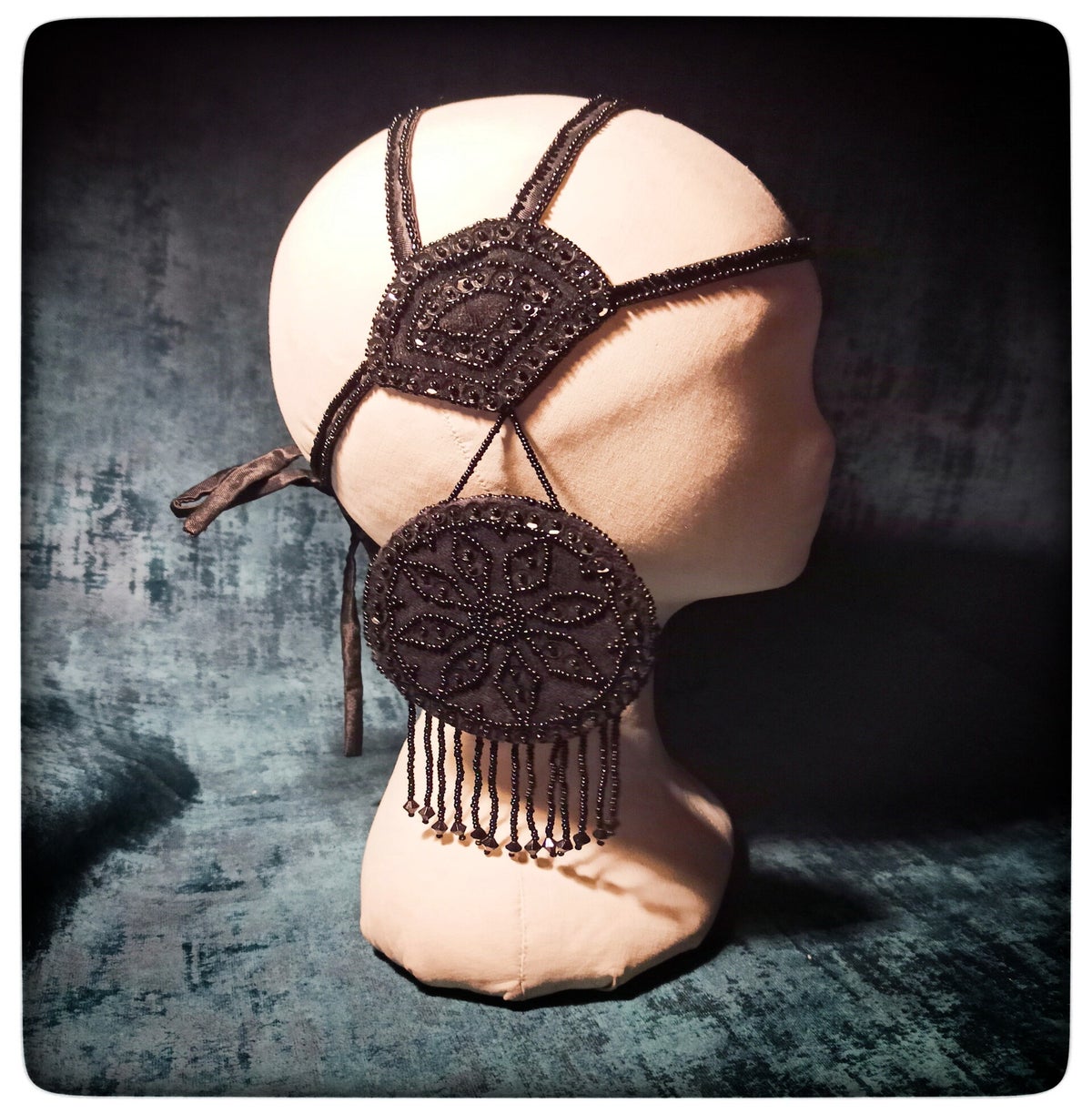 This stunning headpiece is crafted from a combination of black velvet and satin, intricately embroidered with black beads and sequins for a refined and elegant look.