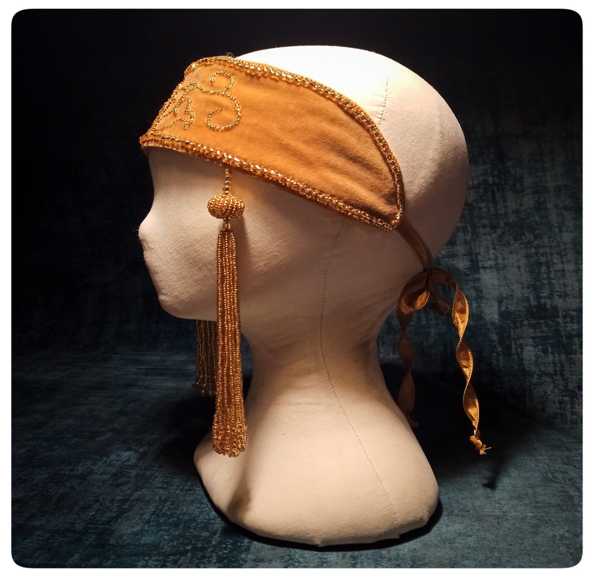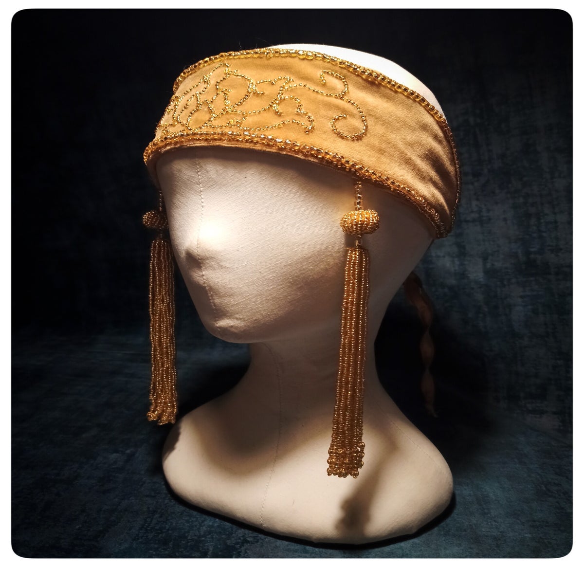This exquisite headpiece is crafted from rich golden velvet, intricately embroidered with gold glass beads in an elegant Chinese-inspired pattern.